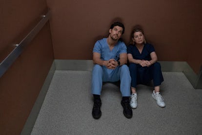 As the two became tangled in each other after another attempt to open the elevator vent, Meredith cited her professional superiority as the reason why they couldn't date.